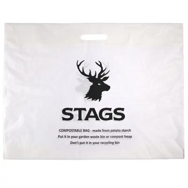 • Printed 100% Compostable Carrier Bags with cut-out handles are being used by more and more companies to go green whilst offering a product that customers want to see and use