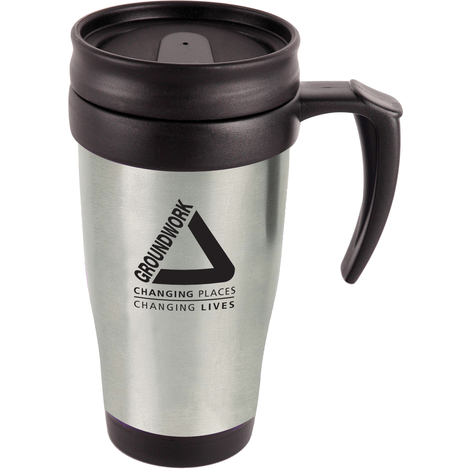 Material Stainless steel travel mug with a black plastic liner and handle