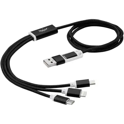 • Braided nylon charging cable with 5 different connectors: Type-C input, USB-A input, Type-C output, AppleĀ® iOS output, and micro USB output